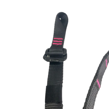 A terceira é uma fita em formato de daisy chain que possibilita ajuste conforme tamanho do usuário onde é conectada a fita elástica, numa ponta se conecta a polia ou prussik mecânico, e na outra se conecta ao estojo de transporte.