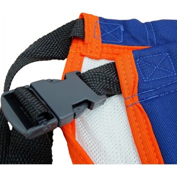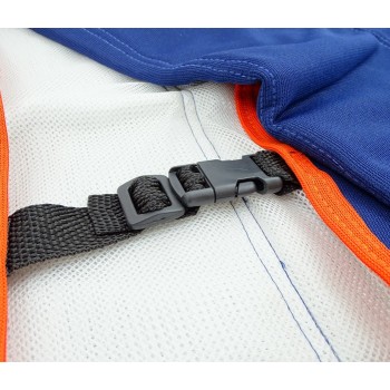 Perneira de segurança confeccionada em tecido de poliéster na parte externa, forro em tecido de poliéster com desenho em forma de colmeia, cinta de poliéster.