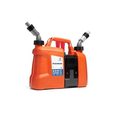 Bidão combinado, desenvolvido com exclusividade pela Husqvarna, tem capacidade de 5 litro de gasolina e 2,5 litros de óleo. Com paredes reforçadas proporcionando maior segurança no transporte de combustíveis e óleos. A válvula antitransbordamento de combustível, tem como função interromper automaticamente o fluxo de combustível e impedir que ocorra transbordamento durante a operação de abastecimento e derramamento ao levantar o bidão. Esse Bidão combinado possui uma caixa de ferramentas e peças de reposição frequentemente necessárias.