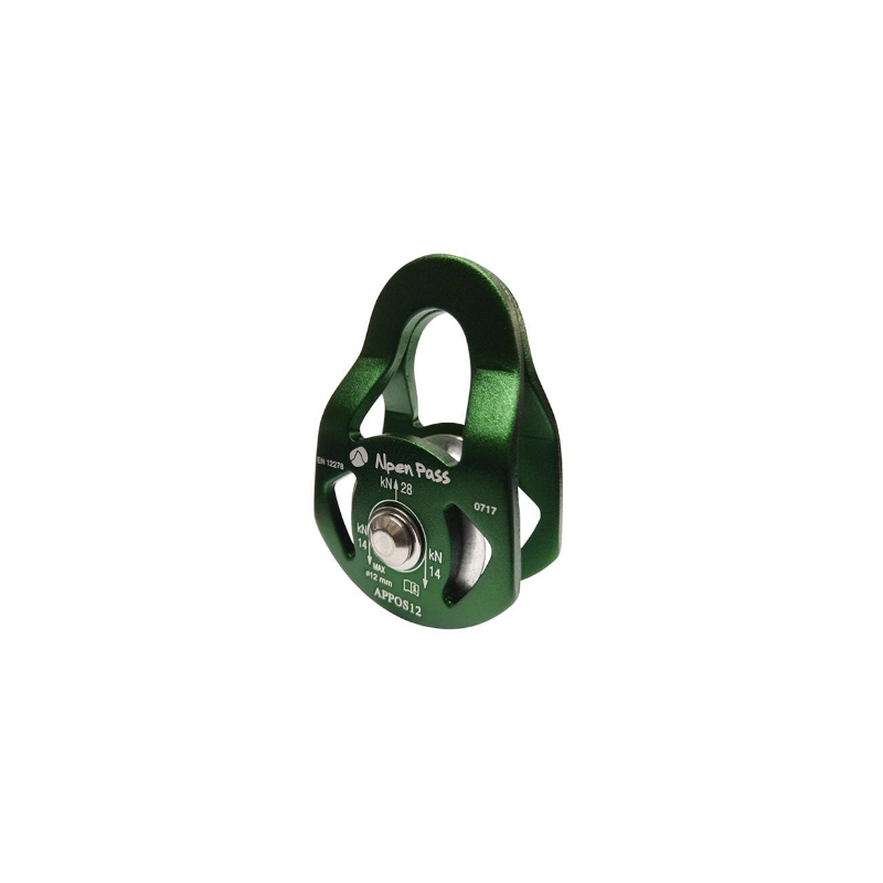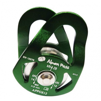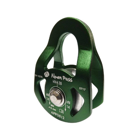 Polia simples para cordas com até 12mm de diâmetro. Placas laterais oscilantes em duralumínio anodizado e roldanas em duralumínio polido. Modelo montado em sistema de bucha (não rolamentada). Resistência à ruptura de 28KN (14KN para cada lado) e carga máxima de utilização recomendada de 240kg.